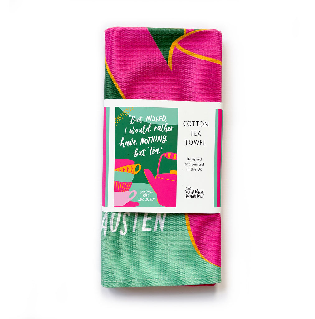 A perfectly imperfect Jane Austen-inspired tea towel featuring the words "But indeed, I would rather have nothing but tea" - ideal for adding a bright vibe to your kitchen or sending to a friend. The tea towel comes folded and wrapped in paper packaging showing the full design.