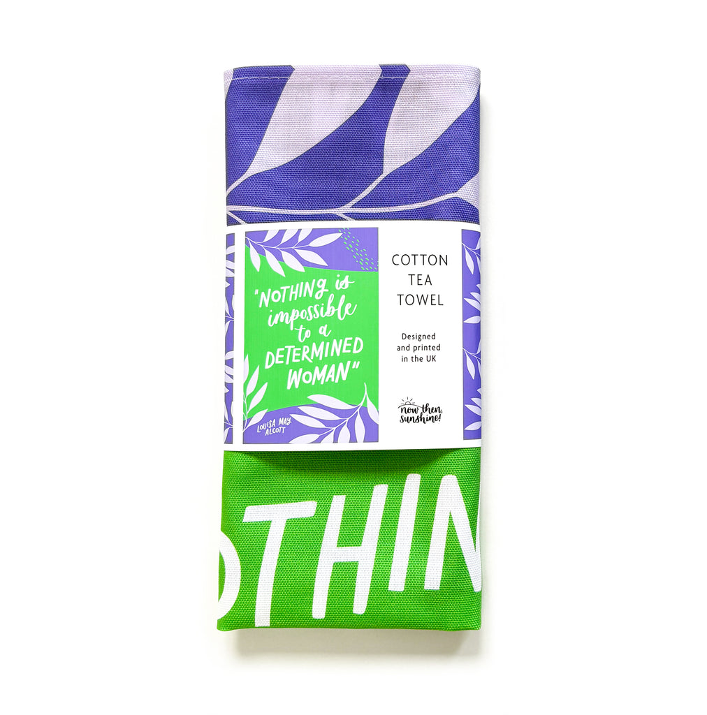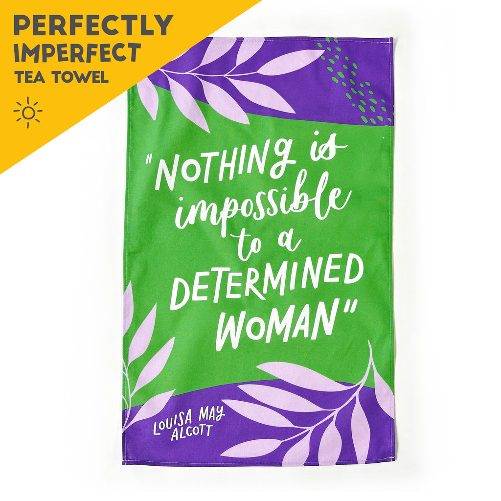 A perfectly imperfect literary-inspired tea towel featuring the words "Nothing is impossible to a determined woman" - ideal for adding a bright vibe to your kitchen or sending to a friend. The tea towel comes folded and wrapped in paper packaging showing the full design.